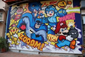 กลุ่มเด็กนักเรียนแลกเปลี่ยนแอ็กชั่นท่าทางถ่ายภาพกับสตรีทอาร์ตอย่างมีความสุข