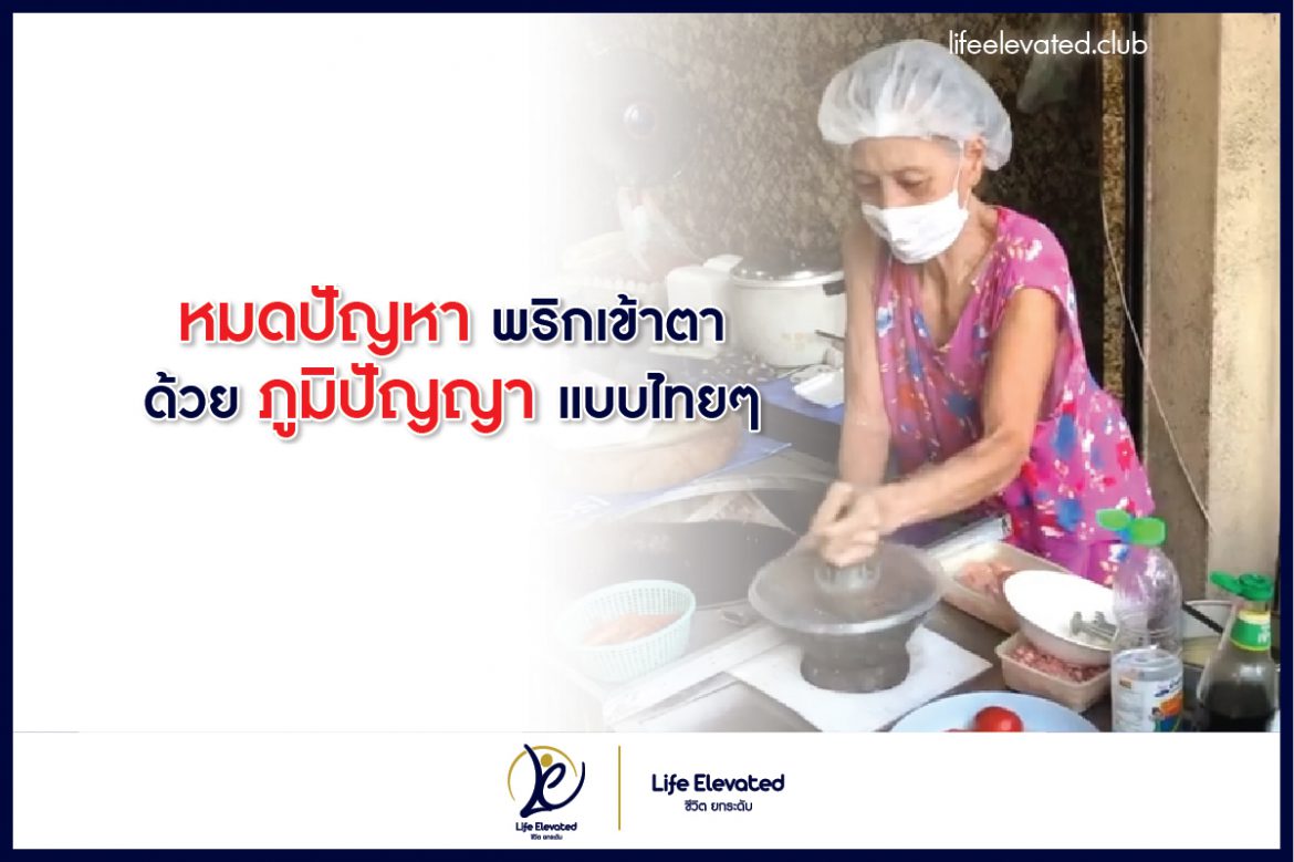 ด้วยปัญหาดังกล่าวก่อให้เกิดภูมิปัญญา “ตำพริกคิดสร้างสรรค์” ไม่กระเด็นให้เข้าตาอีกต่อไป ด้วยการใช้ฝาครอบพลาสติกที่เป็นทรงวงกลมขนาดเส้นผ่าศูนย์กลางประมาณ 20 ซม. หรือใหญ่กว่าปากครกเล็กน้อย ใช้มีดคมกรีดตรงกลาง ทำเป็นแฉกๆ ขนาดพอดีกับช่วงปลายด้านบนของไม้ตำพริกหรือสากกะเบือแล้วตัดปลายที่แหลมออกเล็กน้อย จากนั้นเอาด้ามปลายของไม้ตำพริกดันขึ้นตามรูที่มีรอยกรีด จากนั้นใช้ยางเส้นมัดปลายพลาสติกที่ชูตามไม้ตีพริกให้แน่น แล้วเราก็ตำน้ำพริกได้อย่างสบายใจไม่ต้องห่วงว่าเศษหรือเมล็ดของพริกกระเด็นเข้าตาอีกต่อไป